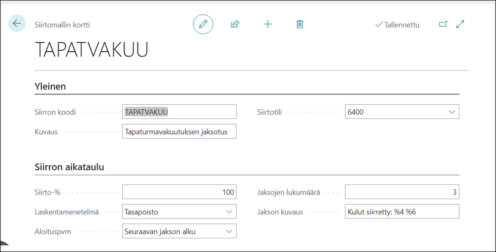 - Tasapoisto: Jaksoittaiset siirtosummat lasketaan jaksojen lukumäärän mukaan. Ne jaetaan jakson pituuden mukaan.