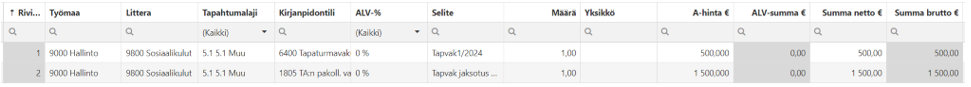Jos haluat jaksotuksen työmaalle, käytä Yleisellä päiväkirjalla jaksotettavalla rivillä työmaanumeroa. Ohjelma jakaa summan annetulle työmaalle eri kausille, kaikille tileille tulee työmaakoodi.