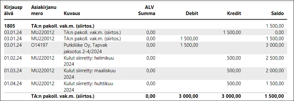 - Ensiksi ohjelma kirjaa tekemäsi viennit muistiotositteelta. Toisella rivillä kumotaan kulutilin kirjaus, jotta ensimmäisellä rivillä olevalla kirjauksella ei ole tulosvaikutusta ja kolmannella rivillä kirjataan uudestaan menoennakoihiin 1805 jaksotuksen summa, jota ohjelma lähtee kuittaamaan.