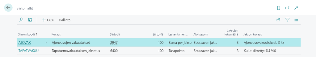Siirtomallin avulla voit kohdistaa tuottoja ja kustannuksia kirjanpitojaksoihin. Tällainen tilanne voi olla esimerkiksi silloin, kun saat toimittajan laskun, joka kattaa useita kirjanpitojaksoja, tai vuokranmaksun, jonka haluat jakaa moneen kirjanpitojaksoon (kuukauteen). Malleja käytetään Yleisillä päiväkirjoilla. Kun mallit kirjataan, järjestelmä luo KP-tapahtumia mallin tietojen pohjalta.