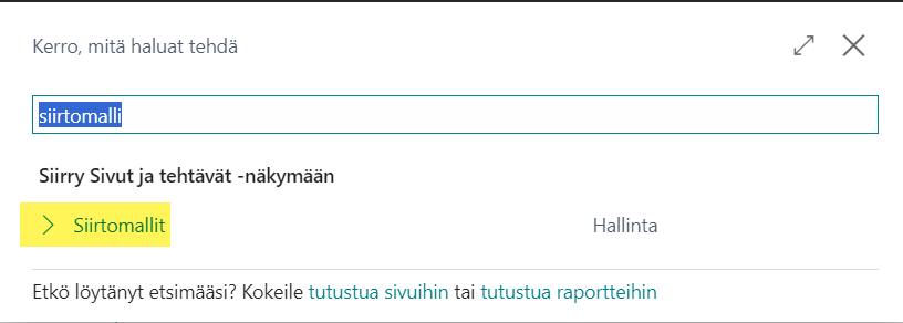 Siirtomallien käsittelyyn pääset kirjoittamalla suurennuslasiin ”Siirtomalli” ja klikkaa siitä Siirtomallit tekstiä: