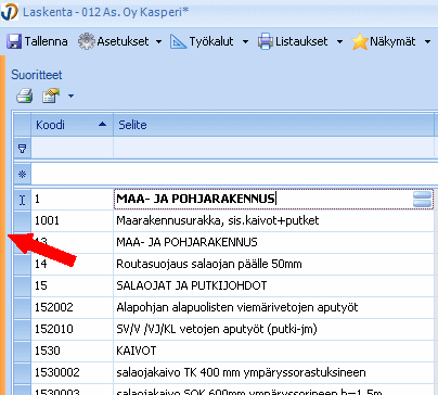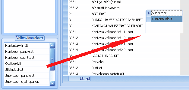 Taulukossa näytetään suoritteet. Jos hankkeella on useampi tuoterakenne, näytetään oletuksena valitun / valittujen tuoterakenteiden suoritteet. Näytettävät sarakkeet valitaan apuvalikon (hiiren kakkospainike) kohdassa Profiilit → Muokkaa. (Ks. Profiilien hallinta).
