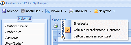 Huomaa: Suoritteiden rajaus (Ei rajausta / Valitun tuoterakenteen suoritteet / Valitun panoksen suoritteet) voidaan valita napsauttamalla hiiren kakkospainikkeella taulukon ”Suoritteet”-otsikkoa tai valitsemalla Asetukset -alasvetovalikosta ”Suoritteiden rajaus”.