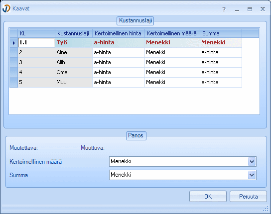 Kustannuslajit -taulukon apuvalikko