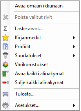 Näkymien tallennus ja poisto tapahtuu vasemman reunan apuvalikon (hiiren kakkospainike) käskyillä. Taulukoiden sarakejärjestykset tallentuvat myös näkymään. (Ks. Sarakevalinnat).