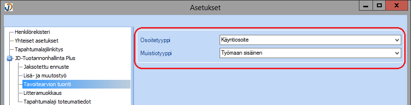 - Muistiotyyppi => valitaan muistiotyyppi, jota käytetään tavoitearvion tuonnissa, mikäli tavoitearvion tuonnissa on valittuna: Muistio tuodaan