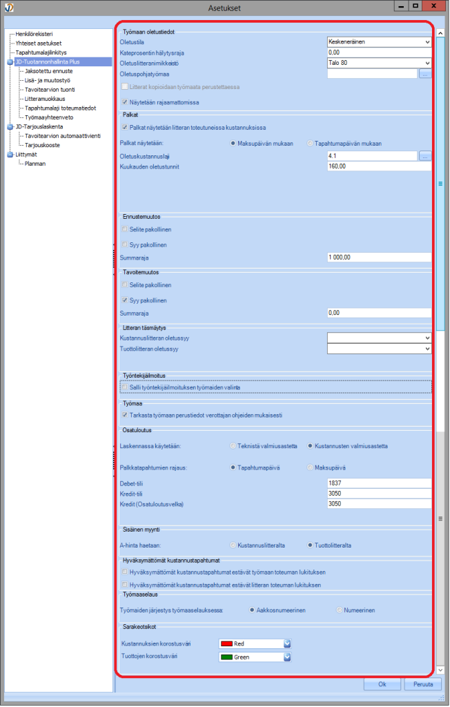 Tuotannonhallinta Plus -osuudessa määritellään ohjelmaa ja työmaita koskevia yleisiä asetuksia. Osaa asetuksista käytetään uutta työmaata perustettaessa oletusasetuksina ja niitä voidaan muuttaa työmaan perustiedoissa. Osa koskee koko ohjelman käyttöä, esim. palkkojen maksupäivän käsittely eli asetukset toimivat kaikilla työmailla samalla tavalla.