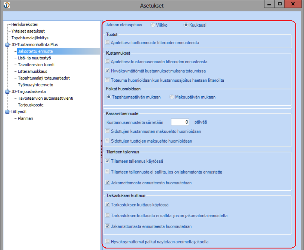 - Tilanteen tallennus käytössä => Jaksotetun ennusteen tilanne voidaan tallettaa
