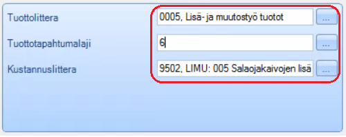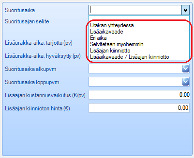 - Valintalistojen oletusarvot tulevat työmaan ohjelman perustiedoista. Lisäkustannusprosenttien esitystavalle on 3 eri vaihtoehtoa