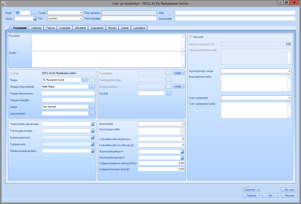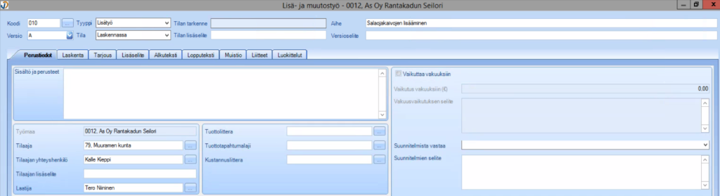 - Perustiedot => Lisä- ja muutostyön perustiedot, kuten tilaajan tiedot, suoritusaika ja sen vaikutukset urakka-aikaan, suunnitelmat ja työn vastaanotto, jne.