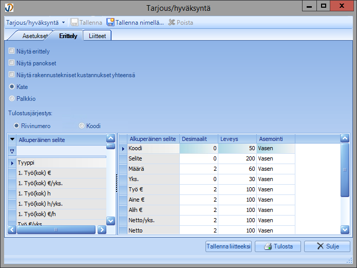 - Tulosta => Valitaan tulostetaan laskennan erittely tai tarjous/hyväksyntä tuloste