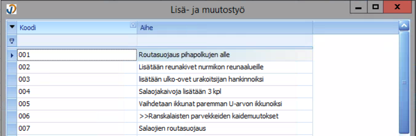 - Luokittelut => lisä- ja muutostyön luokittelut