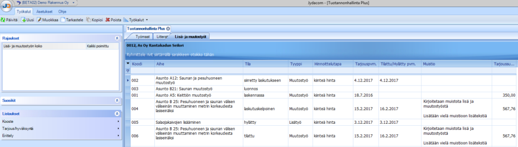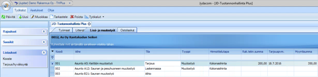 - Koostelistauksella näytetään useamman lisä- ja muutostyön tietoja