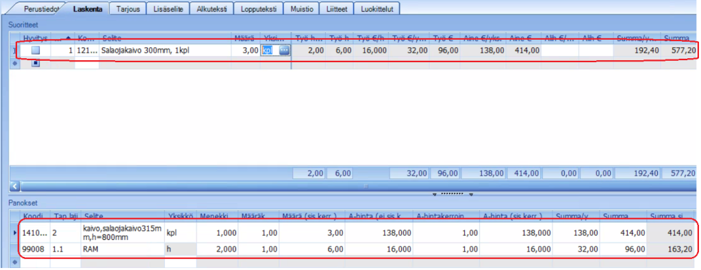 - Esimerkissä lasketaan ensimmäiselle riville salaojakaivojen kustannus. Salaojakaivot ovat ainekustannuksia.