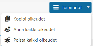 Toiminnot -valikosta tunnukselle voi antaa kaikki oikeudet, poistaa kaikki oikeudet sekä kopioida oikeudet toiselta käyttäjältä.